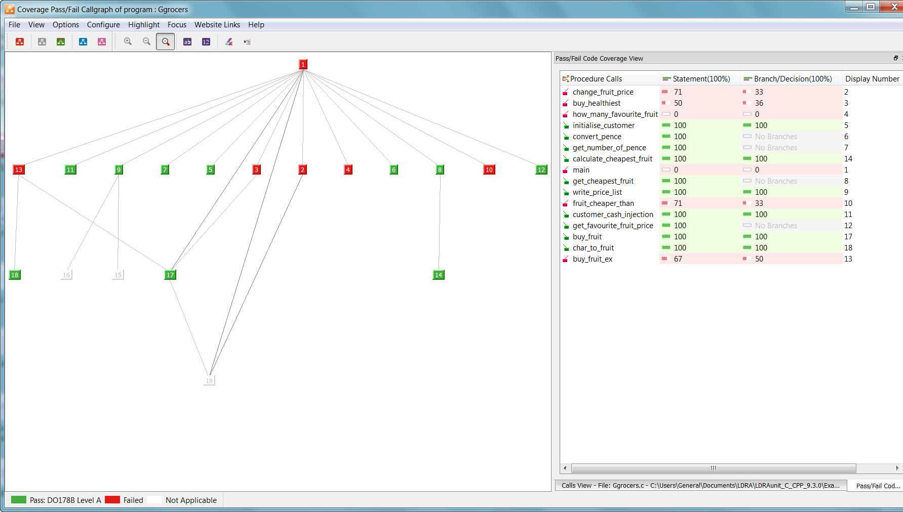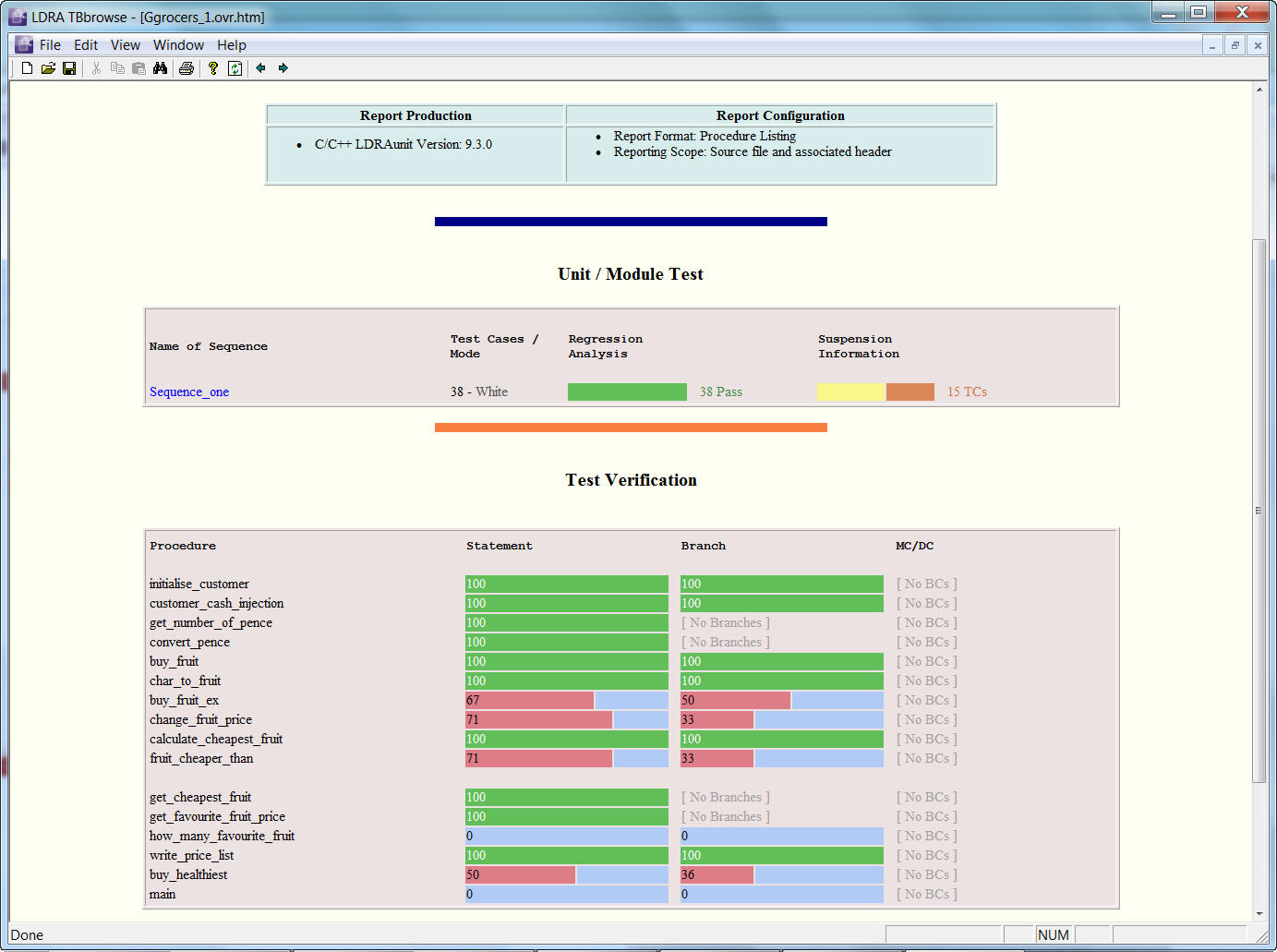 LDRAunit has access to the full range of coverage metrics available in the LDRA tool suite. These include Procedure Call, Statement, Branch/Decision, MC/DC and LCSAJ (Test Path). Users can choose an appropriate metric or set of metrics based on their safety and program constraints. For example, MC/DC coverage is essential to verify results are not masked by condition input conditions and LCSAJ coverage provides a comprehensive metric to evaluate loops. All of these metrics are available graphically, via flow graph displays, call graph displays and the file/view of the LDRAunit GUI. Users can directly access compliance reports to give overall pass / fail metrics for standards such as DO-178B. Line by line views as to which statements, branches and conditions have been executed are also shown in these reports.