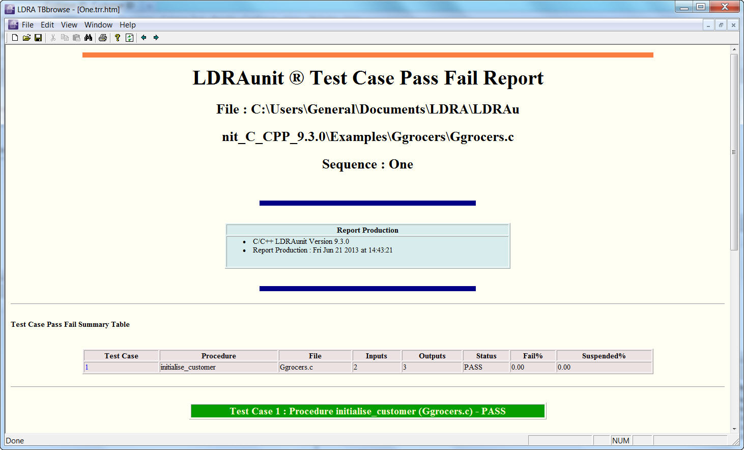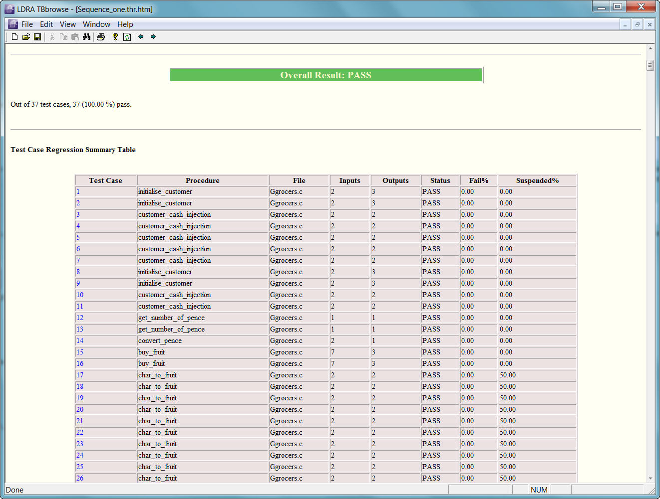 LDRAunit stores groups of test cases as sequences. Users can then export a sequence to a Test Case File (TCF) which contains all of the information required to re-run the test cases. TCF’s can be grouped with regression reports and can be stored for regression verification and either saved with the source file, via a software configuration management (SCM) system, or used as an annotation. Requirements based testing documentation, including why particular values were chosen and tags to map to a requirement management system, can be added for storage. When used as a SCM annotation these files allow managers to determine directly from the SCM system that developers are testing their code on check in. TCF’s can also be re-run from the command line and in batch mode so that as the source code changes module interfaces and output can be verified.