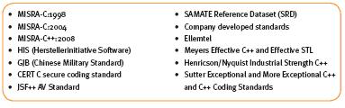 Yazılım takımları endüstri ve şirketiçi kodlama standartlarını verimli şekilde kullanabilirler. LDRA ürün seti günümüzdeki en geçerli C ve C++ kodlama standartlarının uygulanmasını sağlamaktadır.
